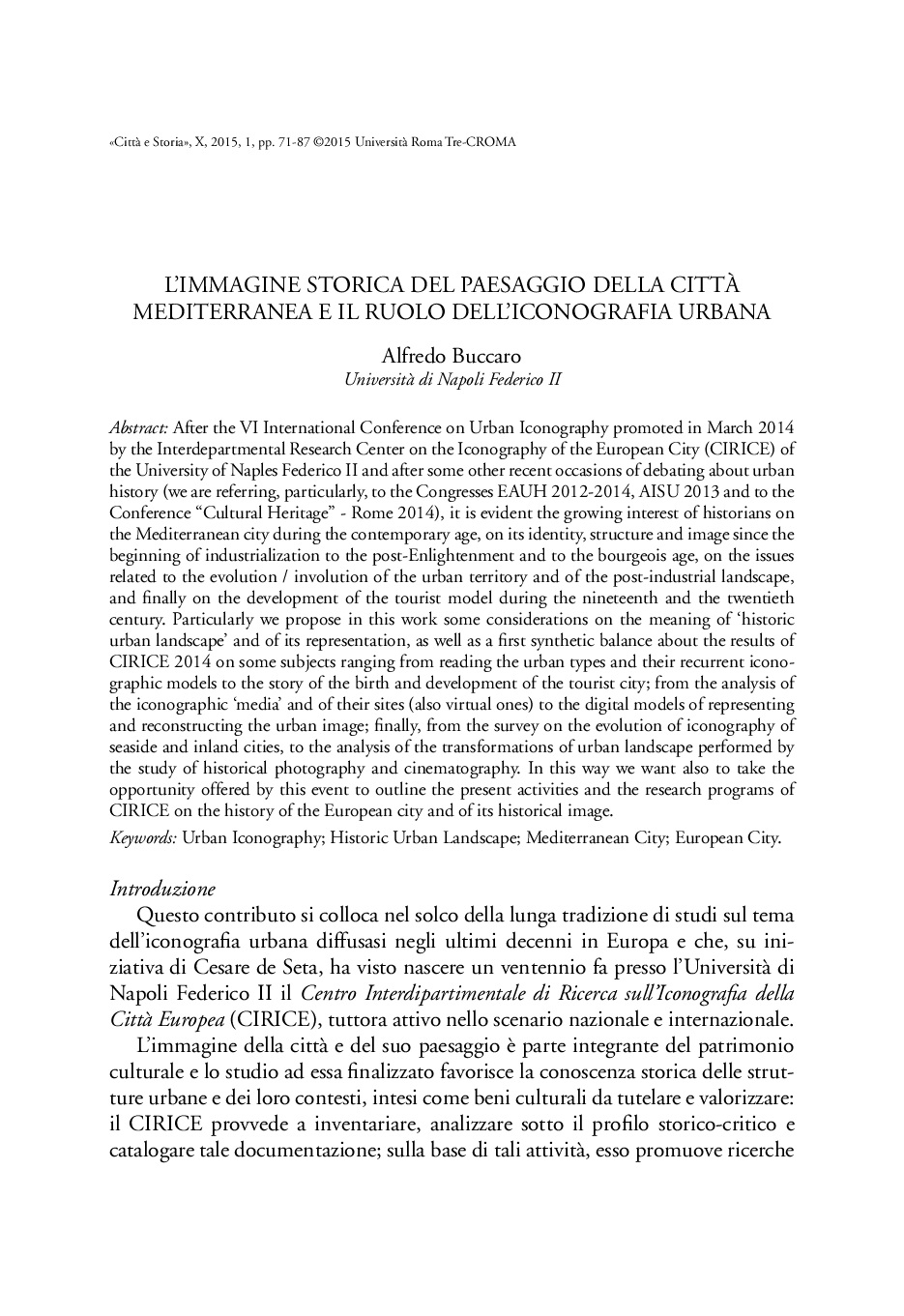 Abstract: After the VI International Conference on Urban Iconography promoted in March 2014 by the Interdepartmental Research Center on the Iconography of the European City (CIRICE) of the University of Naples Federico II and after some other recent occasions of debating about urban history (we are referring, particularly, to the Congresses EAU H 2012-2014, AISU 2013 and to the Conference “Cultural Heritage” - Rome 2014), it is evident the growing interest of historians on the Mediterranean city during the contemporary age, on its identity, structure and image since the beginning of industrialization to the post-Enlightenment and to the bourgeois age, on the issues related to the evolution / involution of the urban territory and of the post-industrial landscape, and finally on the development of the tourist model during the nineteenth and the twentieth century. Particularly we propose in this work some considerations on the meaning of ‘historic urban landscape’ and of its representation, as well as a first synthetic balance about the results of CIRICE 2014 on some subjects ranging from reading the urban types and their recurrent iconographic models to the story of the birth and development of the tourist city; from the analysis of the iconographic ‘media’ and of their sites (also virtual ones) to the digital models of representing and reconstructing the urban image; finally, from the survey on the evolution of iconography of seaside and inland cities, to the analysis of the transformations of urban landscape performed by the study of historical photography and cinematography. In this way we want also to take the opportunity offered by this event to outline the present activities and the research programs of CIRICE on the history of the European city and of its historical image.