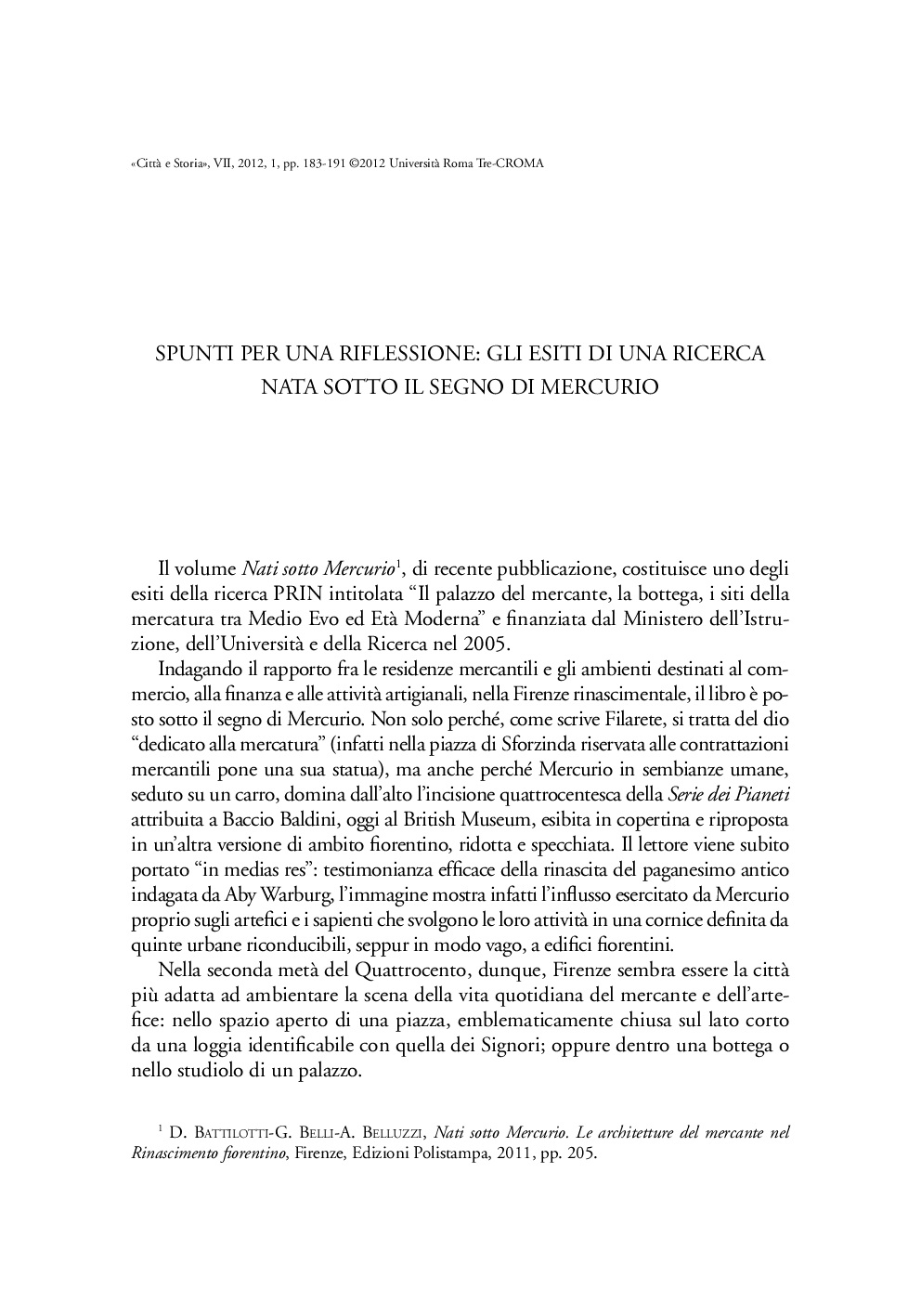- citazione: E. Svalduz, Spunti per una riflessione: gli esiti di una ricerca nata sotto il segno di Mercurio, "Città & Storia", VII/1, pp.183-191, DOI: