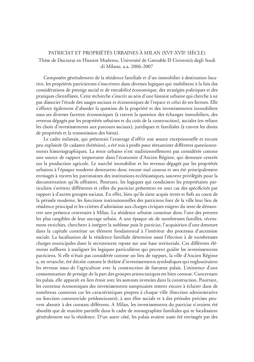 Patriciat et propriétés urbaines à Milan (XVIe-XVIIe siècle) Thèse de Doctorat en Histoire Moderne, Université de Grenoble II-Università degli Studi di Milano, a.a. 2006-2007