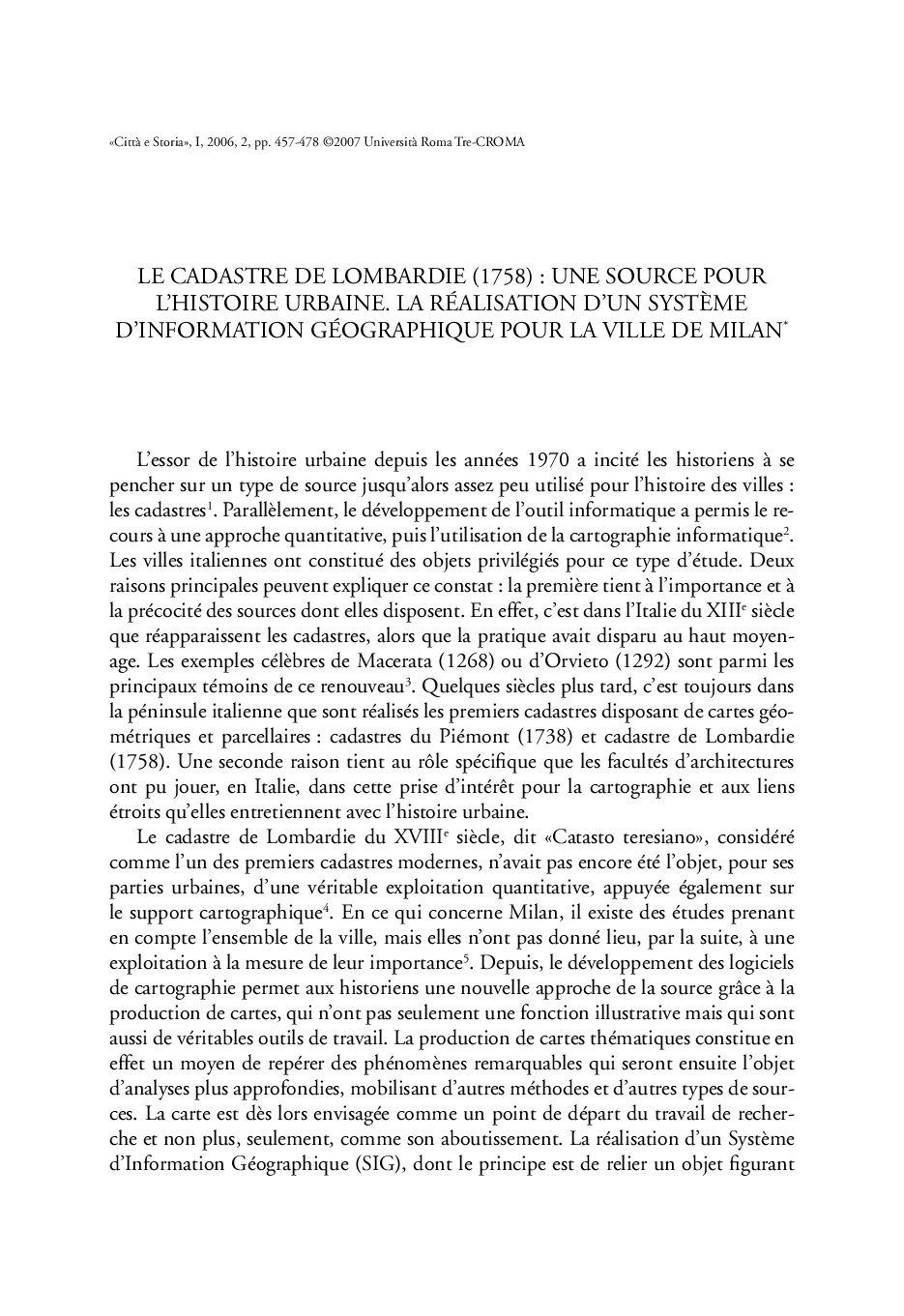 - citazione: A. Cogné, Le cadastre de Lombardie (1758) : une source pour l’histoire urbaine. La réalisation d’un système d’information géographique pour la ville de Milan, "Città & Storia", I/2, pp.457-478, DOI: 10.17426/15007
