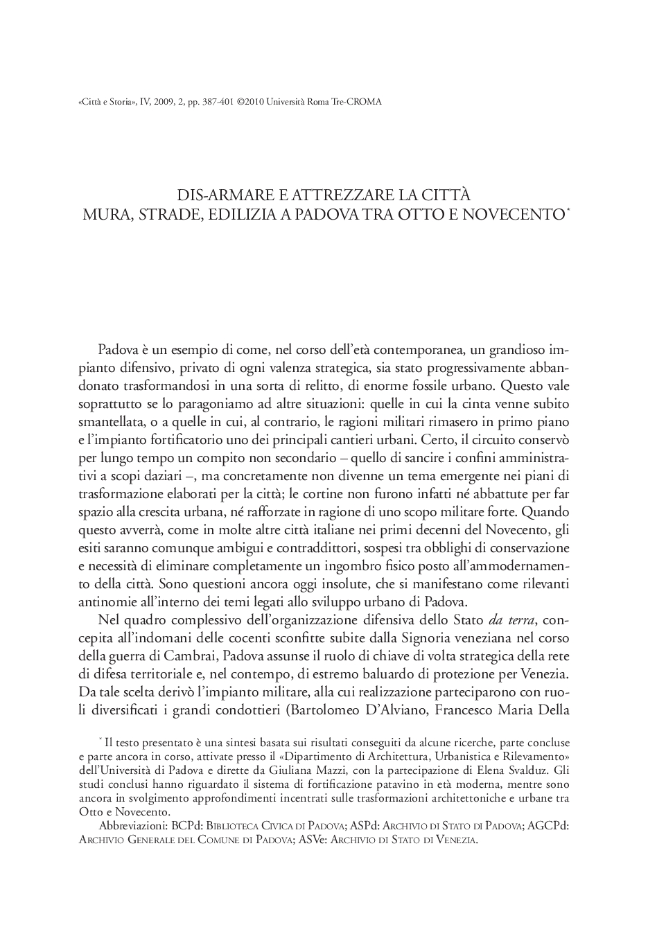 - citazione: S. Zaggia, Dis-armare e attrezzare la città: mura, strade, edilizia a Padova tra Otto e Novecento, "Città & Storia", IV/2, pp.387-401, DOI: 10.17426/69531