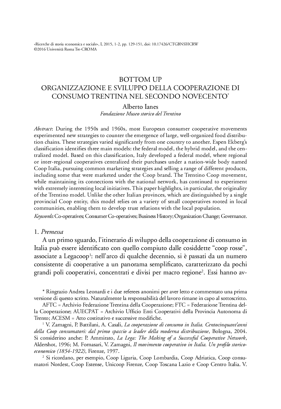 - citazione: A. Ianes, Bottom up. Organizzazione e sviluppo della cooperazione di consumo trentina nel secondo Novecento, "RiSES", I/1-2, pp.129-151, DOI: 10.17426/CTGBNSHCRW
