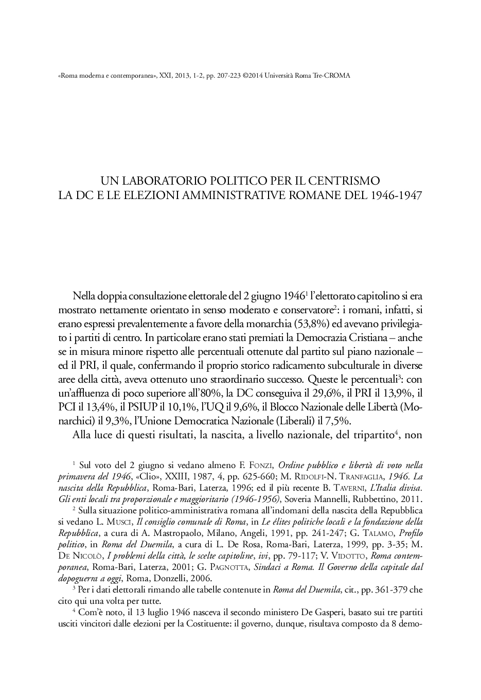 - citazione: P. Carusi, Un laboratorio politico per il centrismo. La DC e le elezioni amministrative romane del 1946-1947, "Roma moderna e Contemporanea", XXI/1-2, pp.207-223, DOI: 10.17426/88306