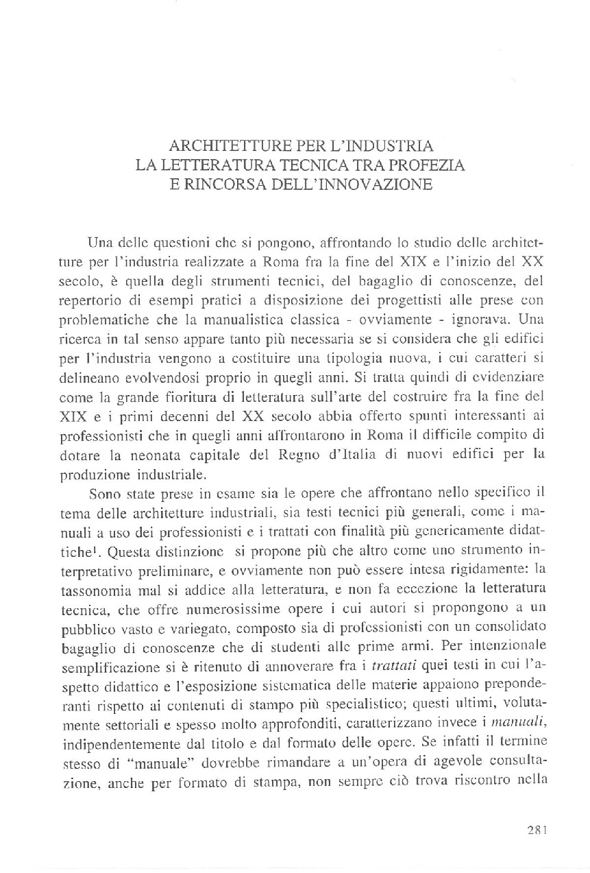 This study proposes a preliminary investigation on the role of technical literature in the designing engineers’ vocational training and professional practice that contributed, in the sixty years marking the end of the nineteenth century and the beginning of the twentieth century, to the realization of the first significant Roman industrial compounds. In examining the prominent catalogue of the University of Rome’s Engineering Department Library different contributing evaluations, both academically as well as professionally speaking, and diversified formulations of the works with general or specific characteristics come about. In its conclusions, comparing handbooks and completed works, this essay anticipates, that the thorough study which look place in the private professional library of Rome’s Passarelli Cabinet, containing the volumes that belonged to Tullio Passarelli, who in the first decades of the 1900’s planned industry and primary importance commercial trade installations, the possibility of finding new grounds for research.
