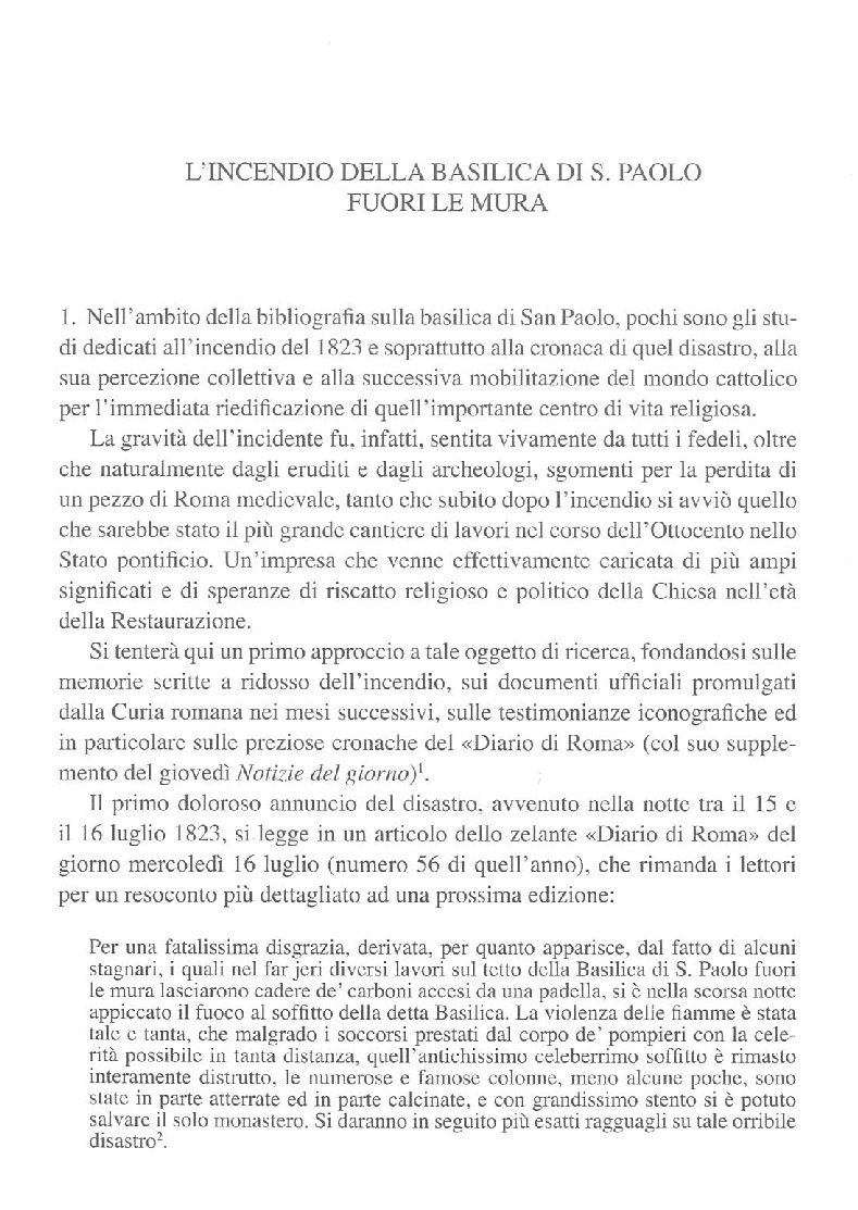 The fire of the basilica of St. Paul’s on the via Ostiense, which broke out during the night between July 15 and 16, 1823, has provided the starting point for a study of the event, reconstructed through the reports and the different recollections of contemporaries. This study focused both on the violent psychological impact on the community and the collective perception of the disaster as well as on the moral obligation assumed by the ecclesiastical authorities and by the entire Catholic world to rebuild the religious centre. This reconstruction effort led to the largest building site in the Papal State during the nineteenth century. The different restoration theories prevalent at the time — an age of transition between Neoclassicism and Purism — soon became a matter of contention in the complete restoration work of the Pauline sanctuary. Most importantly, the restoration represented a political-ideological symbol of the Roman Church’s desire for vindication against its enemies during the years of the Restoration.