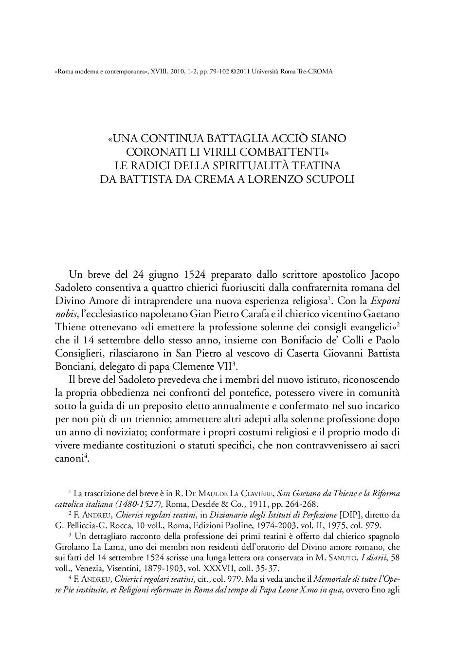 - citazione: A. Vanni, «Una continua battaglia acciò siano coronati li virili combattenti». Le radici della spiritualità teatina da Battista da Crema a Lorenzo Scupoli, "Roma moderna e Contemporanea", XVIII/1-2, pp.79-102, DOI: 10.17426/60317