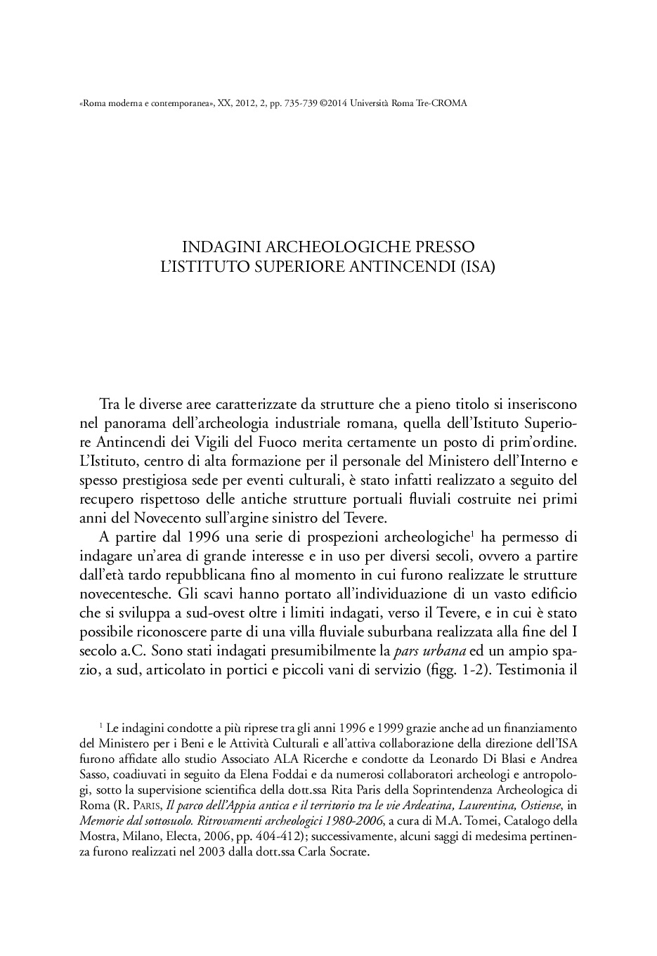 - citazione: L. Di Blasi, E. Foddai, A. Sasso, Indagini archeologiche presso l'istituto Superiore Antincendi (ISA), "Roma moderna e Contemporanea", XX/2, pp.735-739, DOI: 10.17426/49171